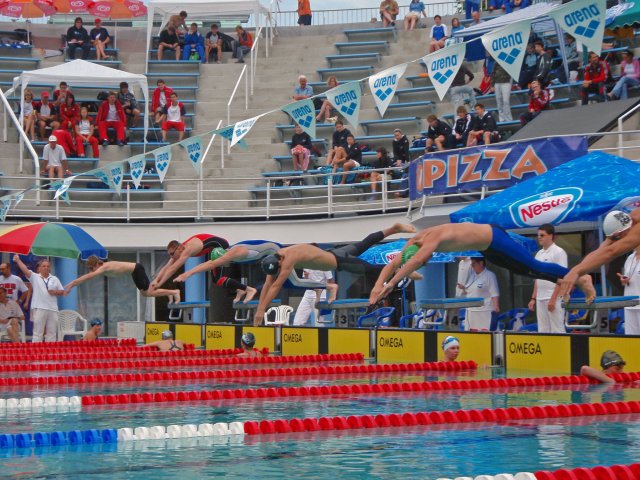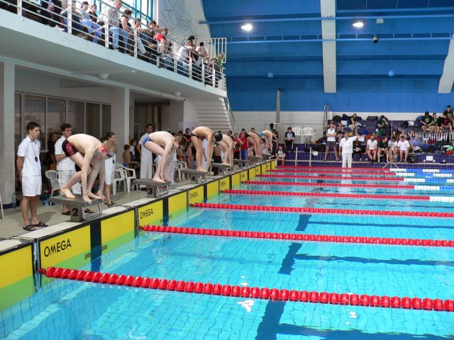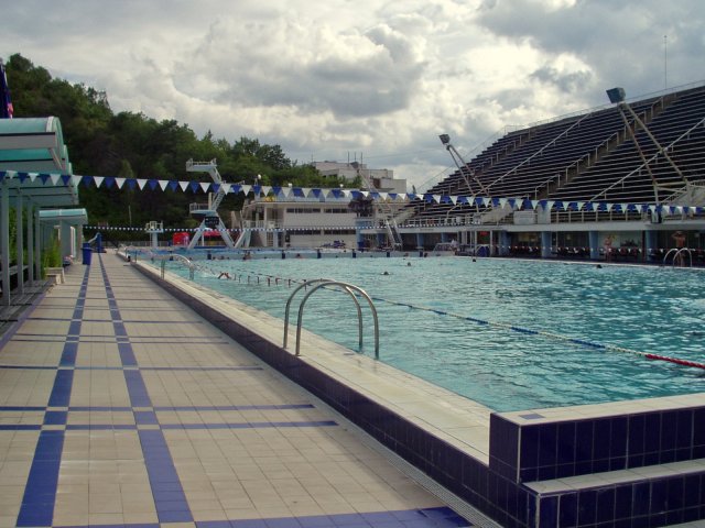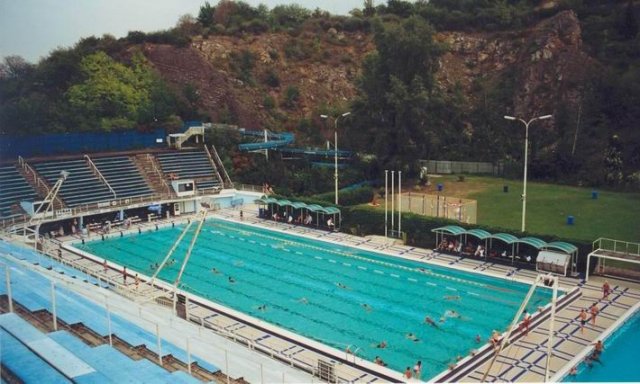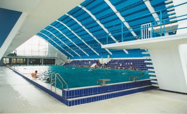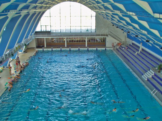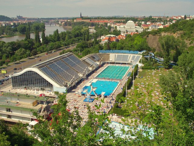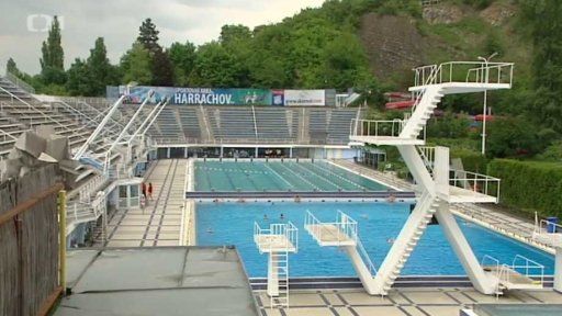9 drah, tribuna pro diváky, celoroční provozvyhřívaný bazén určený pro rekreační plavání, skoky do vody a podobně